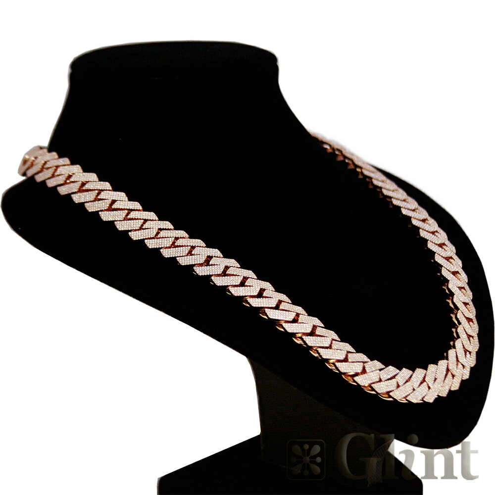 ネックレス素材: 18Kピンクゴールド、ダイヤモンド ネックレスサイズ: 全長約55cm ネックレス幅: 15mm ダイヤモンド: VS1クラリティ カラット数: 約28ct 状態: 新品 近年、多くの海外アーティストやセレブ達が着用していることにより、トレンドのスクエアマイアミキューバンネックレス。