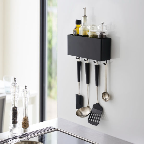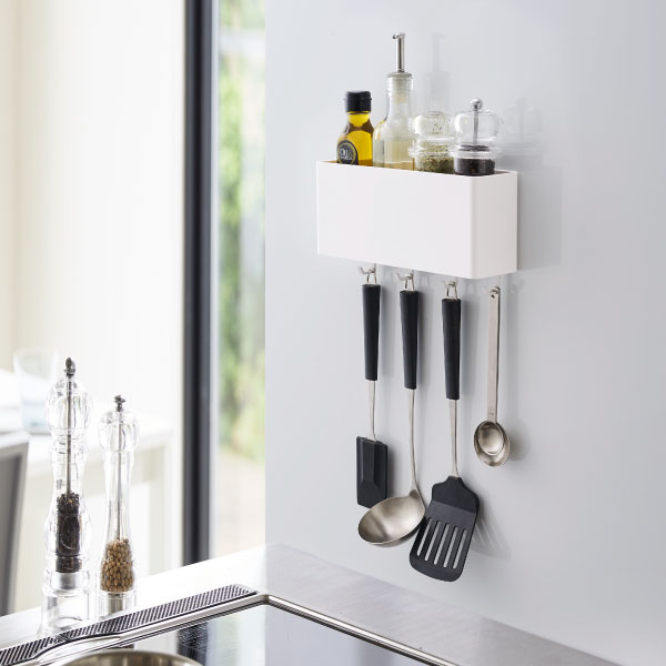 吊り下げ収納に便利なフック付き小物もまとめて収納したい方に フックが4つ付属しており、お玉やフライ返しなどを吊り下げて収納することができます。
