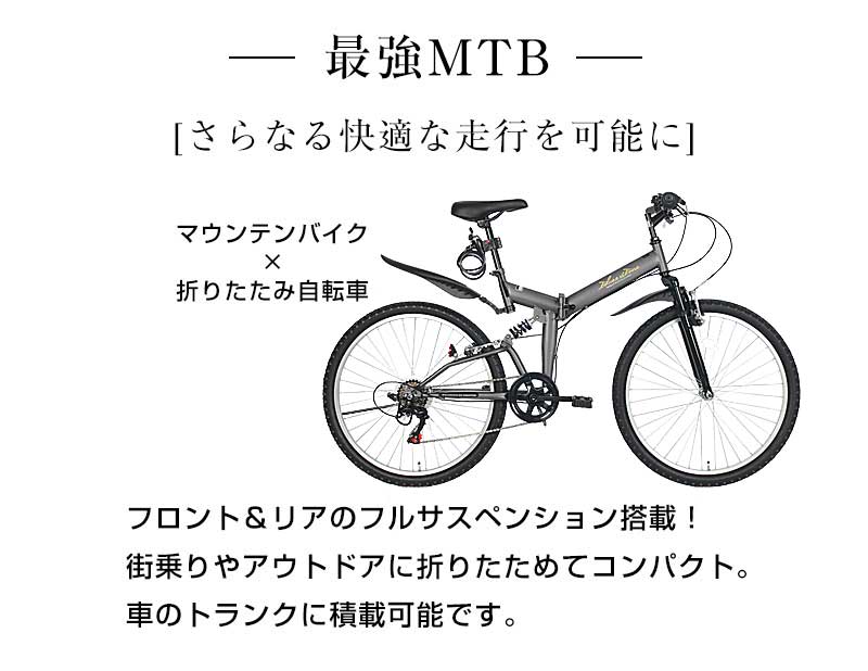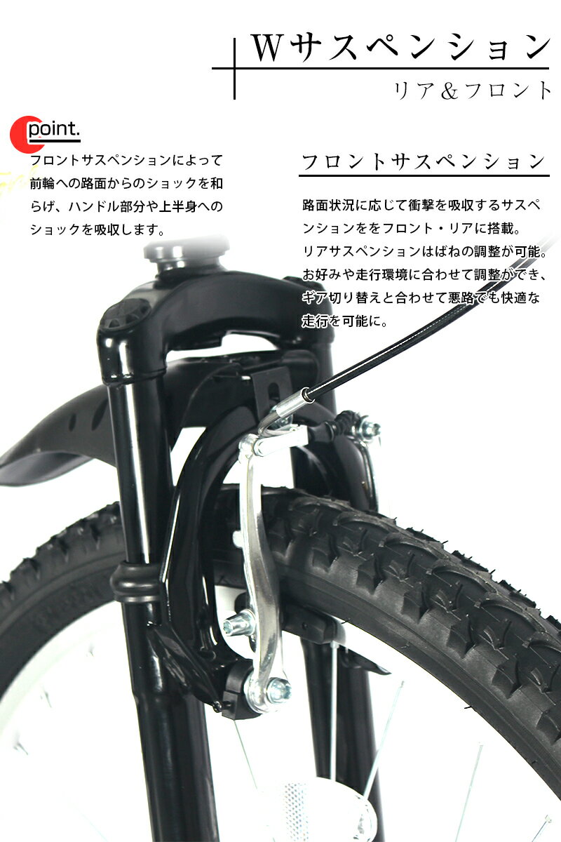 持ち運びにも便利な折りたたみ自転車 簡単に折りたためてスマートに収納! シマノ社製6段ギア・グリップ式チェンジレバー フロントサスペンション・リアサスペンション付き ※カラー展開画像では、実際の商品とは色味が若干異なります。