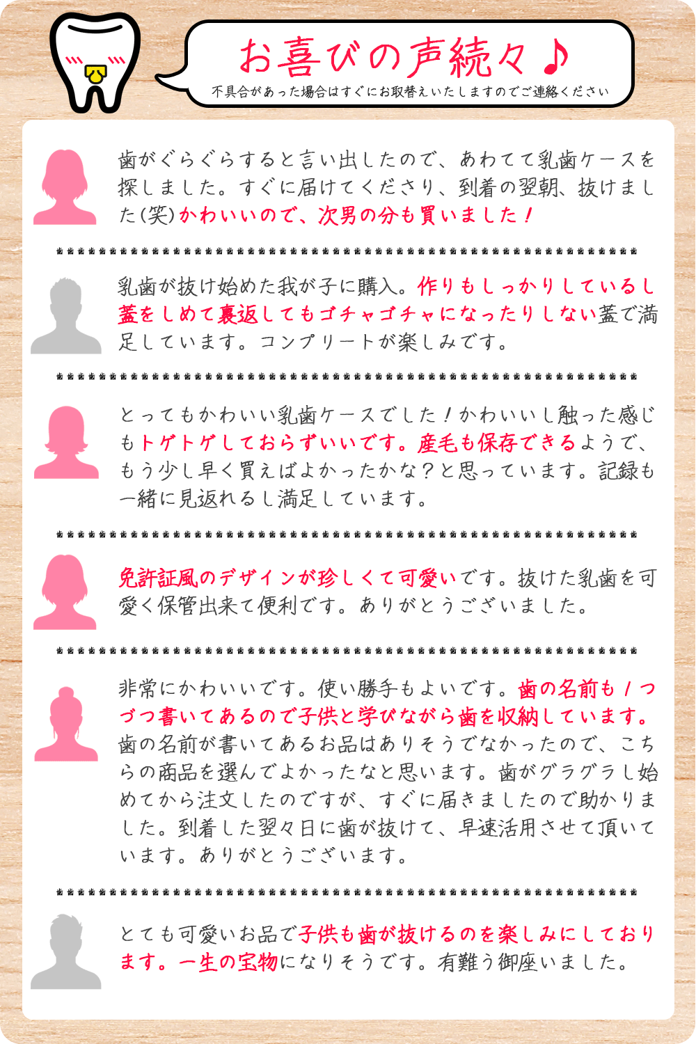 サイズ・重量高さ 約3.2cm、幅 約15cm、奥行 約11cm 重量:約240g【長方形スペース】約 横幅8.5×奥行3.8×深さ1.2cm セット内容乳歯ケース本体、天然の綿(天然素材を使用している為植物のカケラが入っている場合がございますが、無害ですのでご安心ください)、作業用ミニピンセット、 産毛保管用小瓶 記入可能項目名前、生年月日、身長、体重、血液型、開始日(最初に乳歯が抜けた日)、終了日(最後に乳歯が抜けた日) ※免許証風デザインにのみ住所の項目あり 乳歯を保管する穴の部分には、各乳歯の名称と抜けた年月日を記入できます。