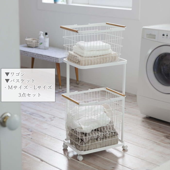 ・Spec 商品名 ランドリーワゴン+バスケットM/L3点セット トスカ 素材 【ワゴン】スチール(紛体塗装)・キャスター:ナイロン 【バスケット】スチール(ユニクロメッキ+粉体塗装)・天然木 サイズ ワゴン:約W40×D29×H69.5cm 耐荷重:1段につき約6kg バスケットM:約W41.5×D31×H26.5cm 容量:23L 耐荷重:約3kg バスケットL:約W41.5×D31×H39cm 容量:33L 耐荷重:約4kg 備考 組み立て式 付属品:六角レンチ・スパナ 詳しくはこちら